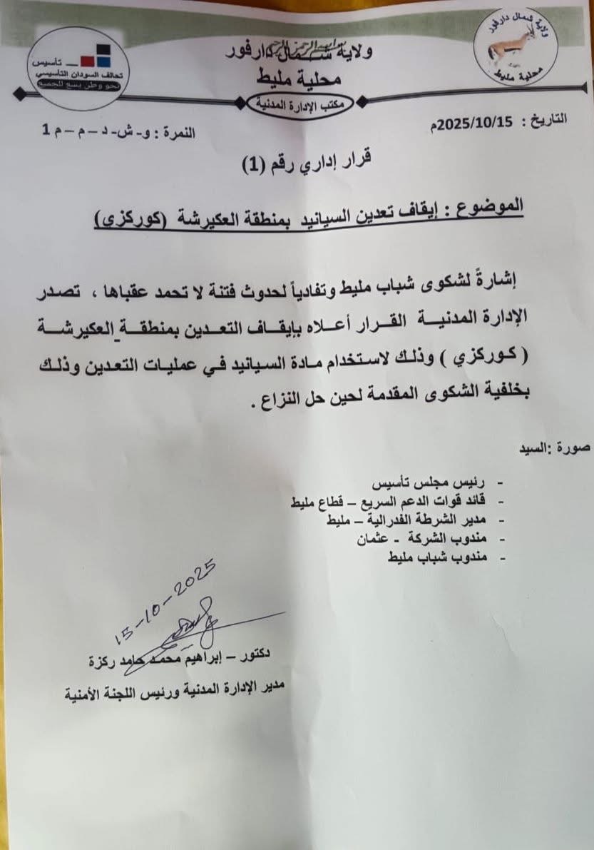 أصدرت الإدارة المدنية بمحلية مليط التابعة لولاية شمال دارفور، اليوم الأربعاء 15 أكتوبر 2025م، قراراً إدارياً رقم (1) يقضي بإيقاف عمليات التعدين باستخدام مادة السيانيد بمنطقة العكيرشة (كوركري)، وذلك على خلفية شكاوى تقدم بها شباب المنطقة وتحسباً لحدوث فتنة مجتمعية.