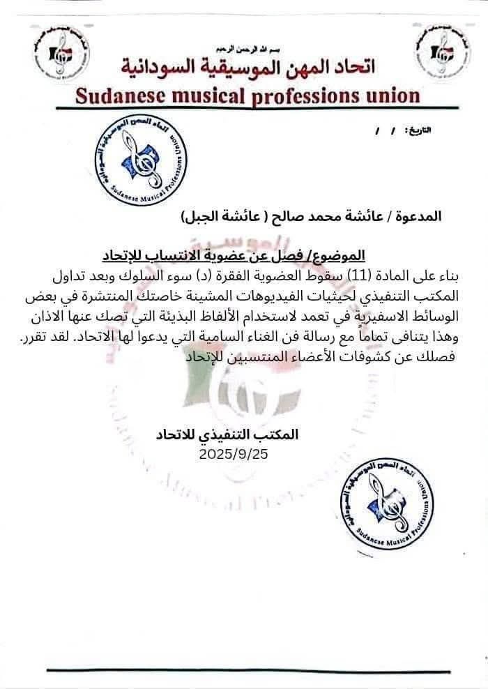 الخرطوم – 25 سبتمبر 2025 أصدر اتحاد المهن الموسيقية السودانية قراراً بفصل الفنانة عائشة محمد…