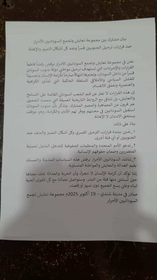 أصدرت مجموعة تعايش وتجمع السودانيين الأحرار بياناً مشتركاً، أدانا فيه بشدة قرارات ترحيل مواطني دولة…