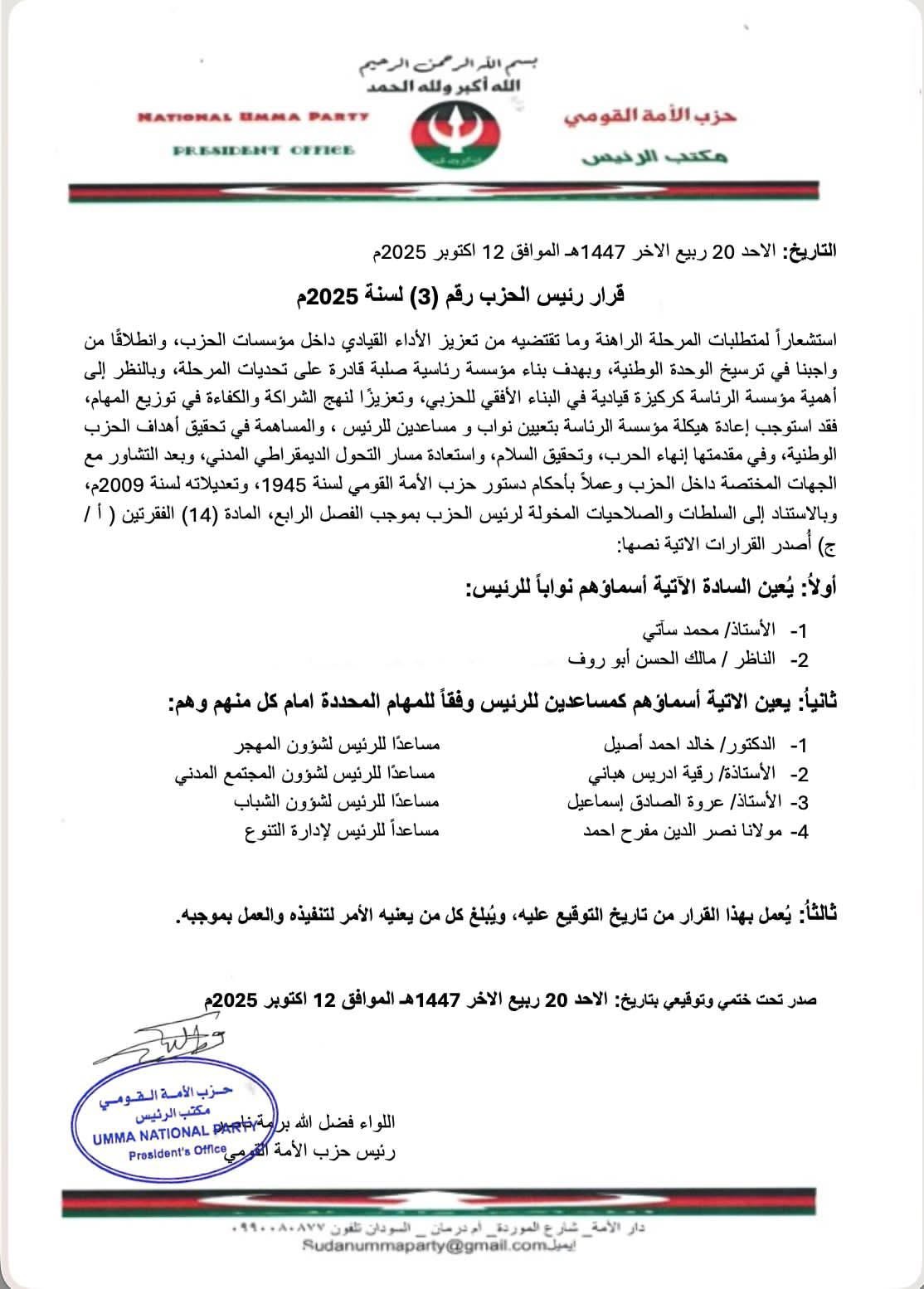 رئيس حزب الأمة القومي يصدر قراراً بتعيين نواب ومساعدين له